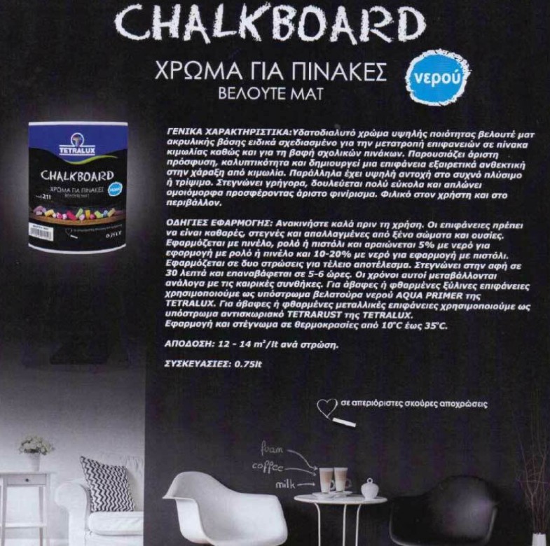 Εφαρμόζεται επάνω σε οποιαδήποτε επιφάνεια, τοίχο, ξύλο, μέταλλο κτλ. Στεγνώνει γρήγορα και αποδίδει ομοιόμορφο τελείωμα με εξαιρετικές αντοχές στο πλύσιμο. Είναι άοσμο, χωρίς αμμωνία. Υδατοδιαλυτό χρώμα υψηλής ποιότητας βελουτέ ματ ακρυλικής βάσης ειδικά σχεδιασμένο για τη βαφή σχολικών πινάκων. Παρουσιάζει εξαιρετική πρόσφυση, καλυπτικότητα και η επιφάνεια του είναι πολύ ανθεκτική στην χάραξη από κιμωλία. Έχει υψηλή αντοχή στο συχνό πλύσιμο ή τρίψιμο. Στεγνώνει γρήγορα ,δουλεύεται πολύ εύκολα και απλώνει ομοιόμορφα προσφέροντας άριστο φινίρισμα. Είναι ιδανικό για την μετατροπή επιφανειών σε πίνακα κιμωλίας.
