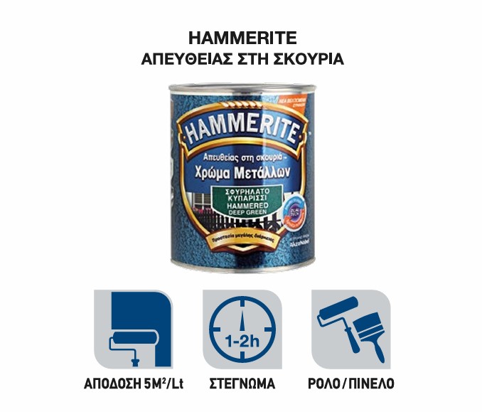 Το HAMMERITE ΑΠΕΥΘΕΙΑΣ ΣΤΗ ΣΚΟΥΡΙΑ είναι χρώμα μετάλλων για εφαρμογή απευθείας σε σκουριασμένο μέταλλο. Η ειδική του σύνθεση περιλαμβάνει υπόστρωμα και τελικό χρώμα σε μία συσκευασία, εξασφαλίζοντας προστασία για μεγάλο χρονικό διάστημα σε κάθε εσωτερική ή εξωτερική μεταλλική επιφάνεια. Παρέχει λεία στην αφή διακοσμητική εμφάνιση και αντιδιαβρωτική προστασία.Έχει ισχυρή πρόσφυση, μεγάλη σκληρότητα και εξαιρετικό φινίρισμα.