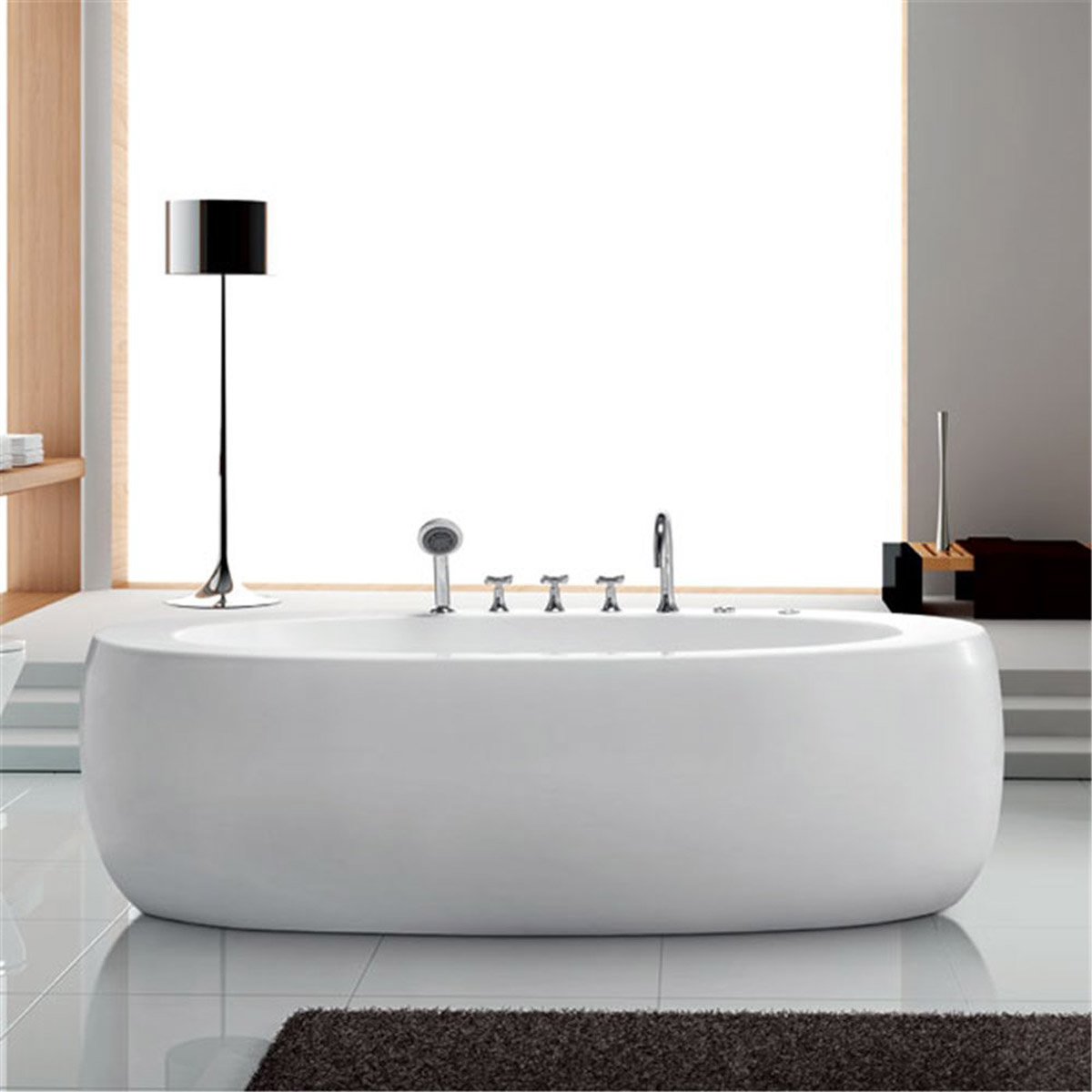 Freestanding heavy duty hydro massage bath, internally and externally coated with high quality acrylic sheet 5mm. It has a full set of taps, hand shower, mixer and waterfall. The bathtub is equipped with 6 jets O85. It also has pneumatic controls and automatic valve. The bath has a 1HP/750W pump complete with anti-vibration bases. It is packed in wooden box and carton.