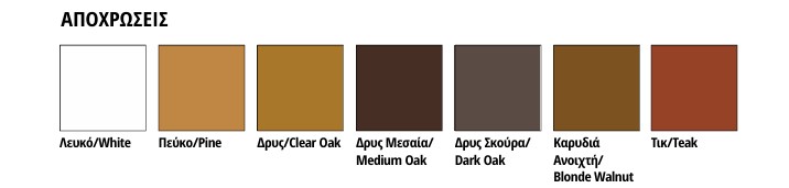 • Αποχρώσεις: Πολλαπλές φυσικές αποχρώσεις (Πεύκο, Δρυς, Καρυδιά, Μαόνι κ.α.)