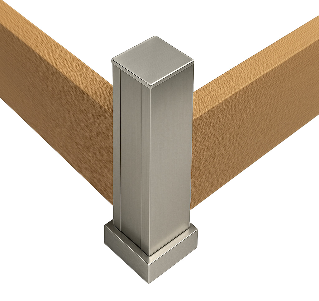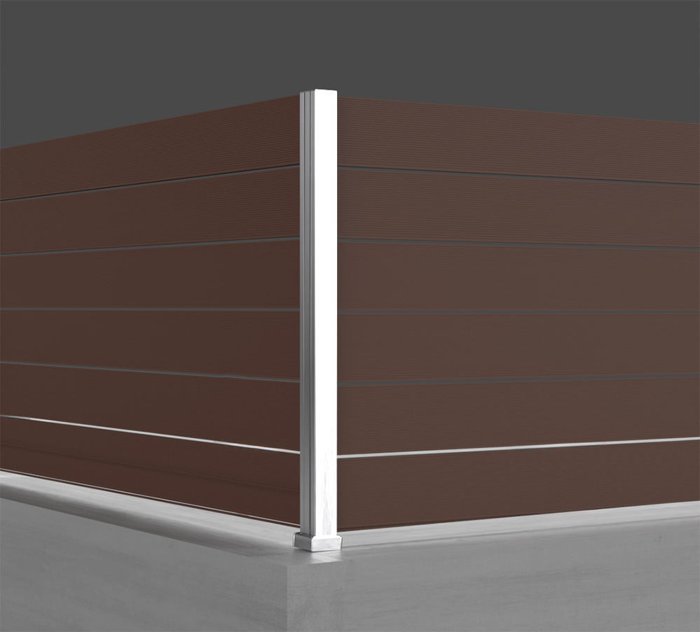 Η κολώνα έχει ενσωματωμένες εσωτερικές εσοχές για την εφαρμογή των WPC περίφραξης και κουμπώνοντας τα αξεσουάρ μπορεί να δημιουργηθεί κολώνα γωνιακή ή σχήματος “Τ”με κρυφή στήριξη χωρίς να φαίνονται οι βίδες!