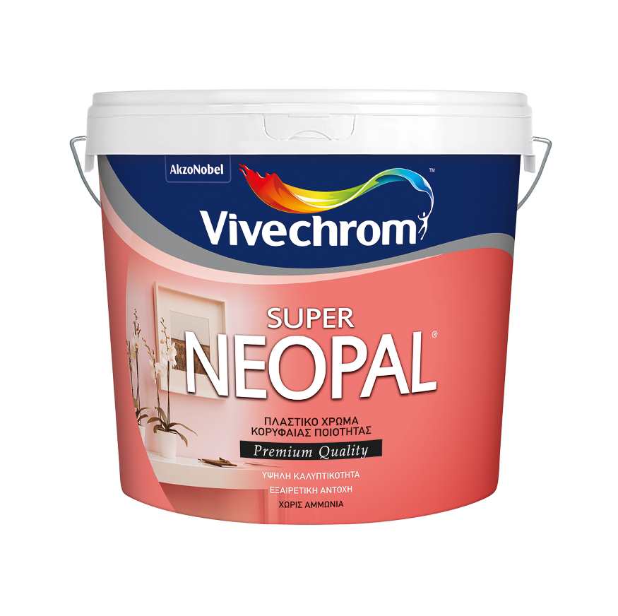 Το Super Neopal της Vivechrom είναι πλαστικό χρώμα κορυφαίας ποιότητας που διακρίνεται για τη μεγάλη του καλυπτικότητα και τις εξαιρετικές αντοχές του στο συχνό πλύσιμο. Δουλεύεται εύκολα, απλώνει θαυμάσια, στεγνώνει γρήγορα και έχει ισχυρή πρόσφυση. Το φωτεινό του λευκό και οι ζωηρές και αναλλοίωτες αποχρώσεις προσφέρουν ένα άψογο ματ φινίρισμα, δημιουργώντας όμορφους χώρους με ξεχωριστή προσωπικότητα. Το Super Neopal εφαρμόζεται σε σοβά, γυψοσανίδες, μπετόν, τούβλα, ξύλα. Δεν περιέχει αμμωνία. Δεν συνεισφέρει στην ανάπτυξη της φωτιάς και την εξάπλωση της φλόγας. Το Super Neopal διατίθεται σε λευκό και σε 9 βασικές αποχρώσεις και σε απεριόριστο αριθμό αποχρώσεων μέσω του συστήματος ΧΡΩΜΟΣΥΝΘΕΣΕΙΣ της Vivechrom και σε συσκευασίες των 200ml, 375ml, 750ml, 3lt και 10lt.