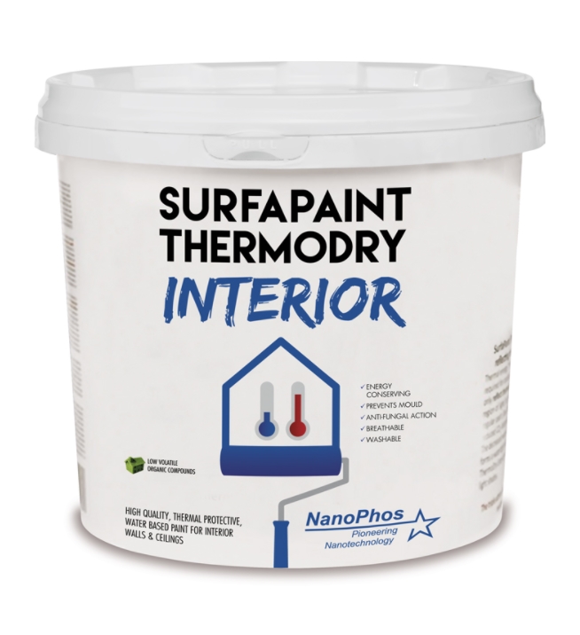 Το SurfaPaint™ ThermoDry Interior είναι ένα υψηλής ποιότητας ακρυλικό χρώμα με θερμοπροστατευτικές ιδιότητες, ιδανικό για εσωτερική χρήση ενισχυμένο με SurfaPaint™ ThermoDry. Η σύστασή του εμποδίζει τη μεταφορά θερμότητας λόγω χαμηλής θερμικής αγωγιμότητας, επαναεκπέμπει τη θερμότητα και αποτρέπει τη διείσδυση της υγρασίας, με αποτέλεσμα σημαντική εξοικονόμηση ενέργειας κατά τη διάρκεια του χειμώνα και του καλοκαιριού. Ως εκ τούτου, το SurfaPaint™ ThermoDry Interior προσφέρει εξαιρετική καλυπτικότητα και πλυστικότητα, ισχυρή πρόσφυση, ελαστικότητα, αντιμυκητιακή δράση, σημαντική μείωση της θερμικής αγωγιμότητας και υδατοαπωθητικότητα. Αποτελεί ιδανική λύση για την πρόληψη της ανάπτυξης μούχλας, καθώς αποτρέπει το σχηματισμό θερμογέφυρων και ελαχιστοποιεί την συμπύκνωση της υγρασίας στις κρύες επιφάνειες των τοίχων.