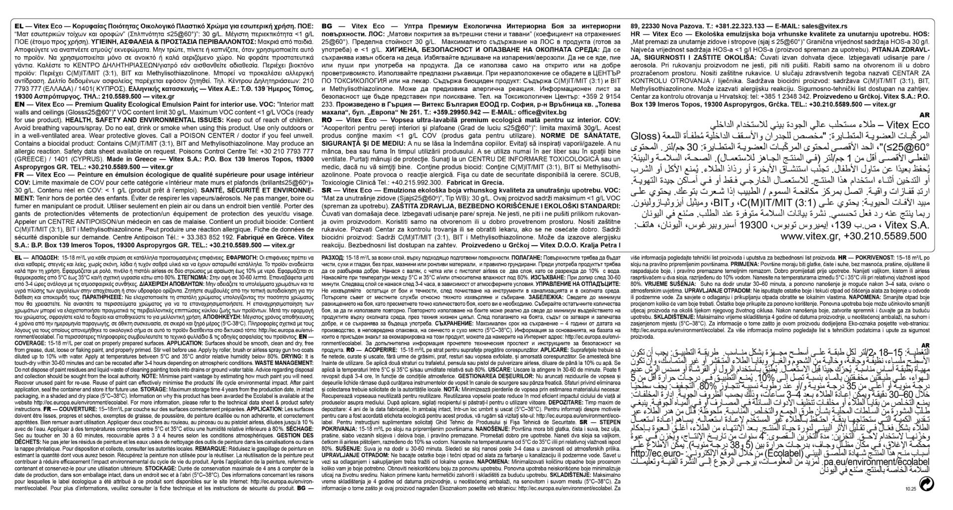 Vitex Eco Κορυφαίας Ποιότητας Οικολογικό Πλαστικό Χρώμα Λευκό Ματ 10lt
