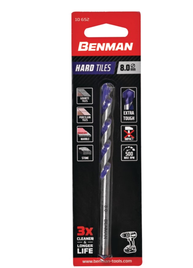 Διαμαντοτρύπανο Benman Hard Tiles διαστάσεων 6 mm x 100 mm, κατάλληλο για διάτρηση σκληρών πλακιδίων, γρανίτη και κεραμικών επιφανειών. Εξασφαλίζει ακριβή και καθαρή διάτρηση χωρίς ρωγμές, ενώ η ανθεκτική διαμαντένια επίστρωση προσφέρει μεγάλη διάρκεια ζωής. Ιδανικό για επαγγελματική χρήση αλλά και για απαιτητικές εργασίες τοποθέτησης πλακιδίων.