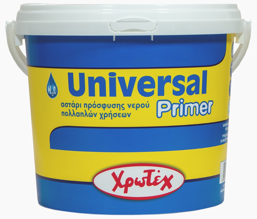 To UNIVERSAL PRIMER είναι ακρυλικό αστάρι νερού νέας τεχνολογίας κατάλληλο για εξωτερική-εσωτερική χρήση με εξαιρετική ικανότητα πρόσφυσης ακόμα και στις πιο απαιτητικές επιφάνειες. Εφαρμόζεται εύκολα, στεγνώνει γρήγορα ενώ ταυτόχρονα παρουσιάζει άριστη καλυπτικότητα, και εξασφαλίζει υψηλή ανθεκτικότητα. Μπορεί να παραμείνει και ως τελικό χρώμα διατηρώντας τις ιδιότητές του και χαρίζοντας ένα εξαιρετικό ημι-ματ φινίρισμα.