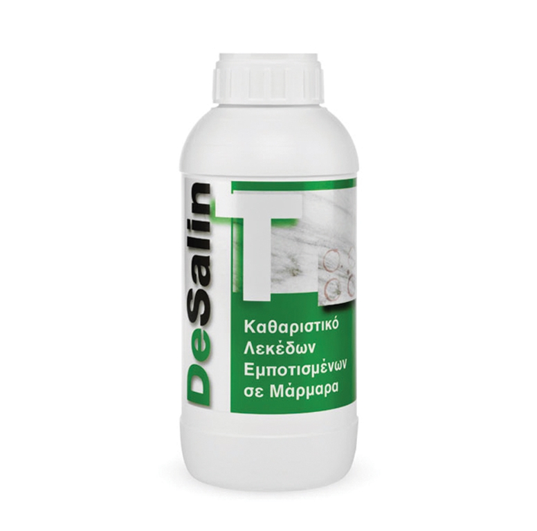 Το DeSalin™ T είναι ειδικό, ιδιαίτερα δραστικό καθαριστικό υγρό, με σκοπό να καθαρίζει γυαλισμένα μάρμαρα ή γρανίτες, χωρίς να αφαιρεί τη γυαλάδα τους ή τη λάμψη τους. Πρόκειται για μοναδικής αποτελεσματικότητας σύνθεση για την απομάκρυνση υπολειμμάτων κρασιού, λαδιού και άλλων επίμονων λεκέδων, χωρίς να τραυματίζει την επιφάνεια.