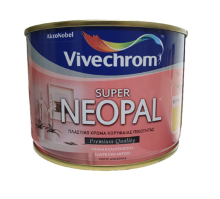 Το Super Neopal της Vivechrom είναι πλαστικό χρώμα κορυφαίας ποιότητας που διακρίνεται για τη μεγάλη του καλυπτικότητα και τις εξαιρετικές αντοχές του στο συχνό πλύσιμο. Δουλεύεται εύκολα, απλώνει θαυμάσια, στεγνώνει γρήγορα και έχει ισχυρή πρόσφυση. Το φωτεινό του λευκό και οι ζωηρές και αναλλοίωτες αποχρώσεις προσφέρουν ένα άψογο ματ φινίρισμα, δημιουργώντας όμορφους χώρους με ξεχωριστή προσωπικότητα. Το Super Neopal εφαρμόζεται σε σοβά, γυψοσανίδες, μπετόν, τούβλα, ξύλα. Δεν περιέχει αμμωνία. Δεν συνεισφέρει στην ανάπτυξη της φωτιάς και την εξάπλωση της φλόγας. Το Super Neopal διατίθεται σε λευκό και σε 9 βασικές αποχρώσεις και σε απεριόριστο αριθμό αποχρώσεων μέσω του συστήματος ΧΡΩΜΟΣΥΝΘΕΣΕΙΣ της Vivechrom και σε συσκευασίες των 200ml, 375ml, 750ml, 3lt και 10lt.