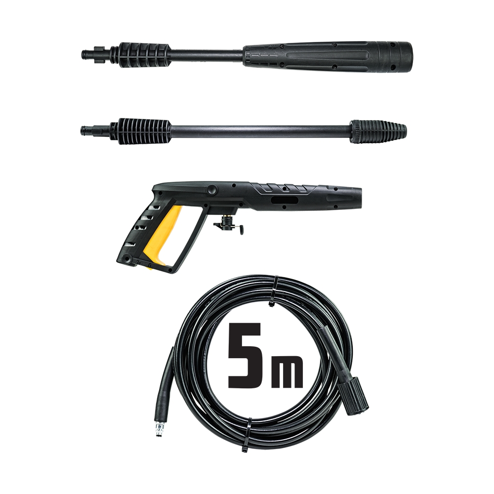 Περιλαμβάνει Κάνη με turbo ακροφύσιο - Ρυθμιζόμενο ακροφύσιο - Πιστόλι - Λάστιχο υψηλής πίεσης 5m
